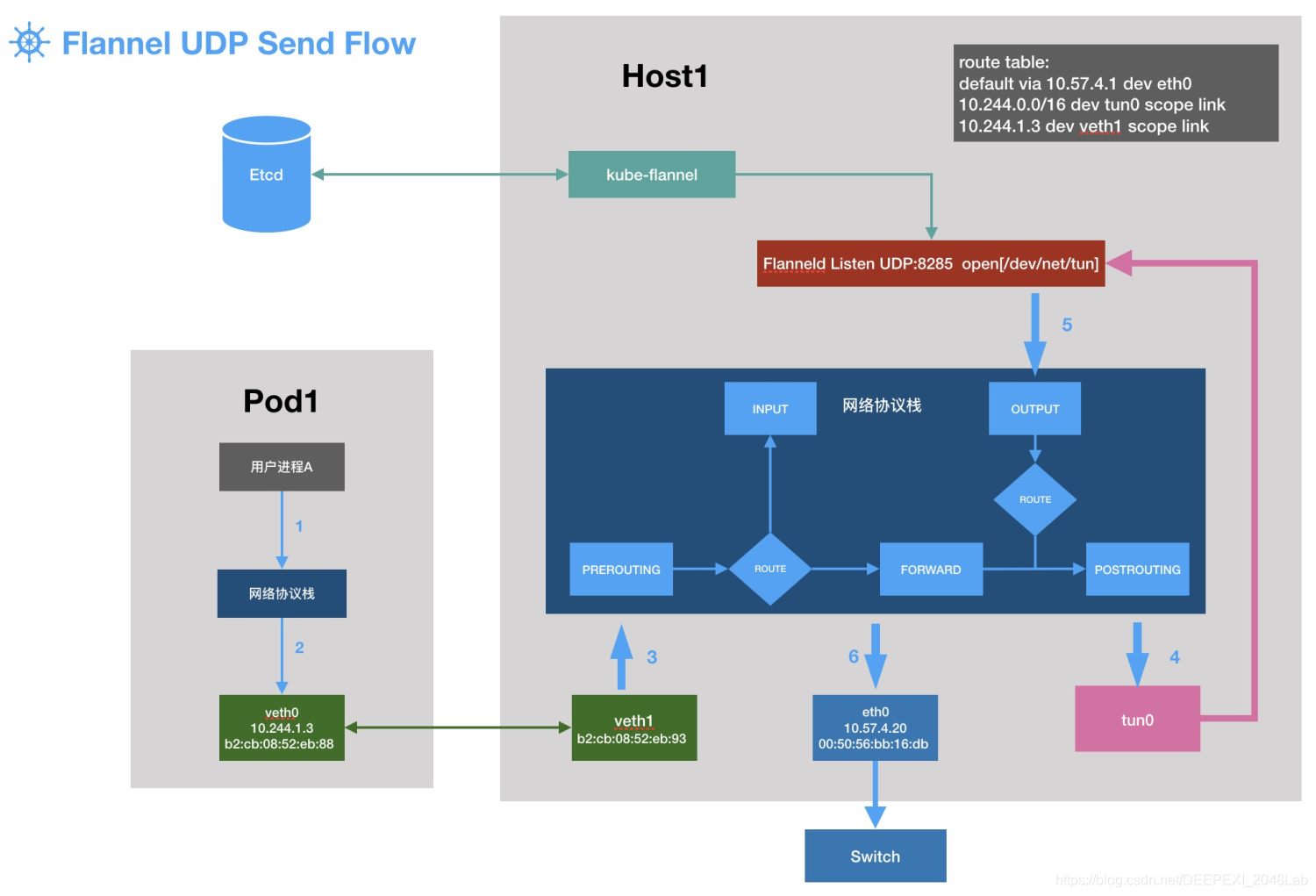 下面一步步地解释上面的部件是怎么联动起来并完成跨主机的POD之间的通信的,在下面我们创建的tun设备名为tun0。