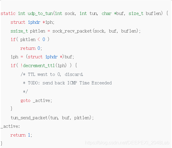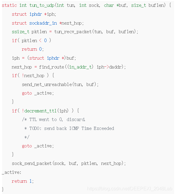 proxy_adm64.c中最关键的就是tun_to_udp和udp_to_tun,光是看名字就已经明白了用途,而且代码还贼精简: