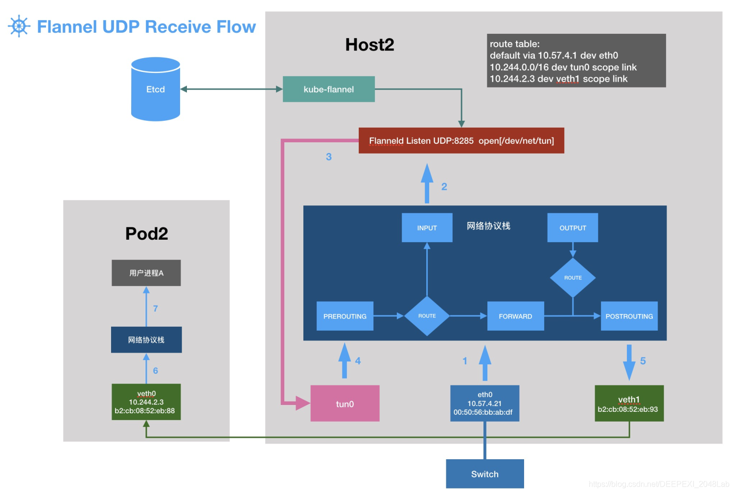 - tun0是一个linux tun设备,从协议栈收的包,会被另一端的用户进程收到,在这里tun0的另一端由flanneld进程打开(就是打开了/dev/net/tun这个文件),于是flanneld收到了数据包。