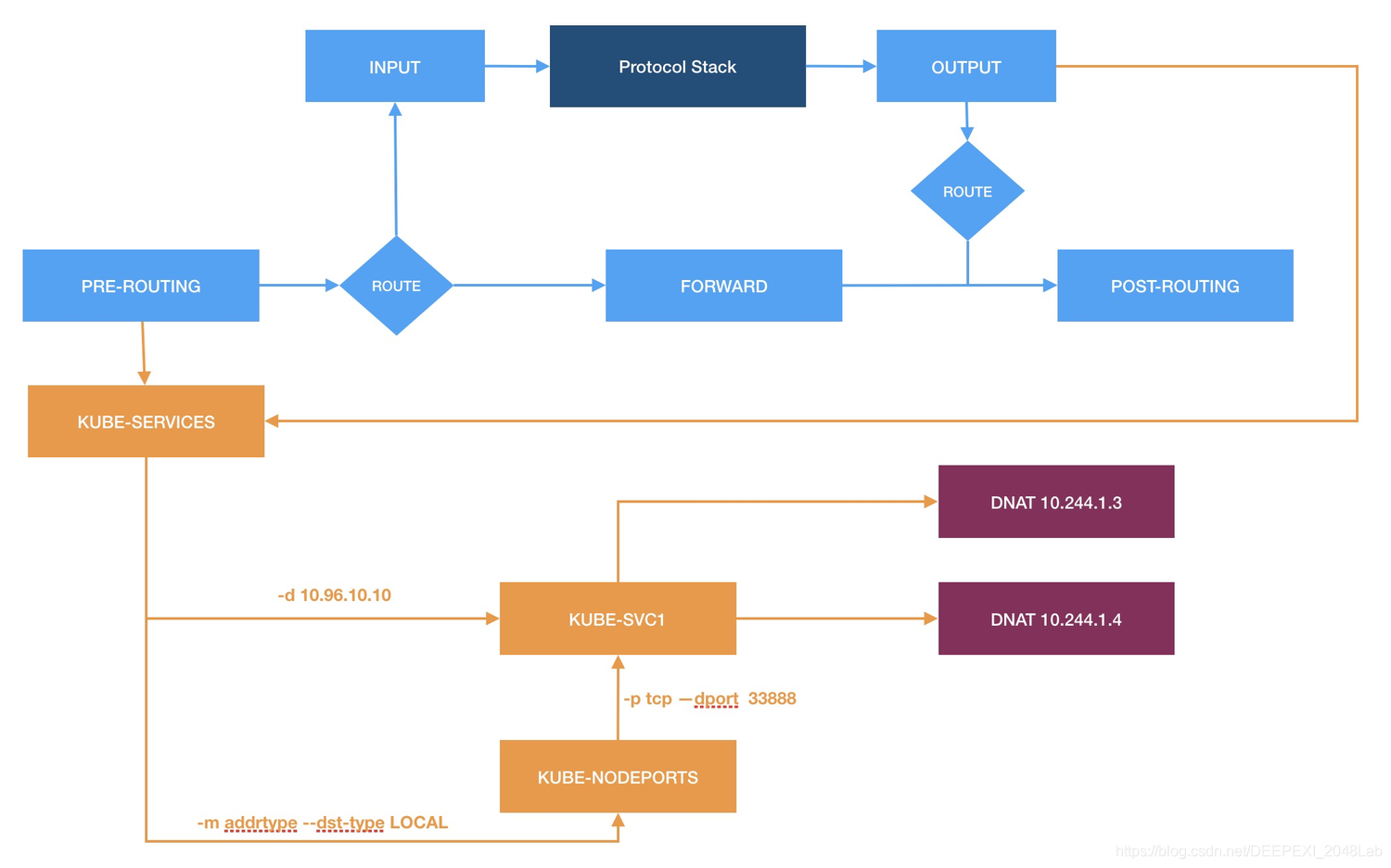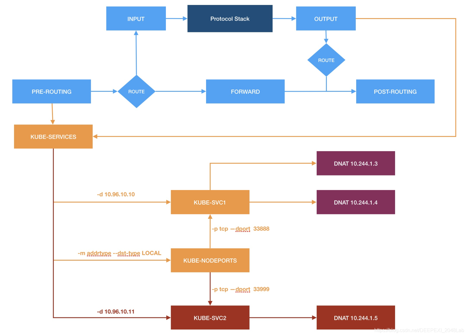 OUTPUT链的规则影响本机应用层出来的数据包,PREROUTING链的规则影响从容器经过本机出外面的数据包,之所以先建一个KUBE-SERVICES链是为了不用把相同的规则在OUTPUT和PREROUTING上重复建一次。
