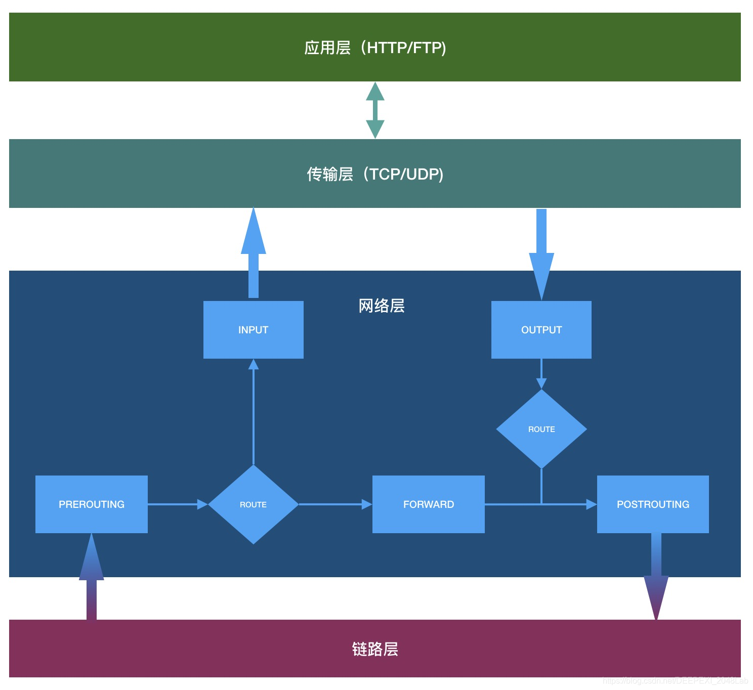 - 数据包从节点应用发到其它节点: OUTPUT -> POSTROUTING