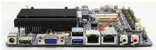 由于网卡已经成为连接网络的必要设备,所以很多网络设备都内置了网卡。因此,内置网卡也被称为集成网卡。例如,现在的主板都集成了有线网卡,如图所示。箭头所指的接口就是内置网卡提供的有线网卡接口。
