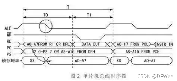 为了节约芯片引脚,采用P0口复用方式,除了作为数据总线外,在ALE信号时序匹配下,通过外置的数据锁存器,在总线访问前半周期从P0口送出低8位地址,后半周期从P0 口送出8位数据。