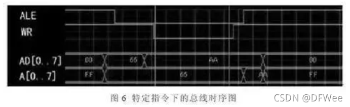 从图6中可以看出,P0口先送55H,在ALE下降沿实现地址锁存,随后送出数据0AAH,在WR有效(低电平)期间锁存器输出低8位地址55H,P0口送出数据0AAH。