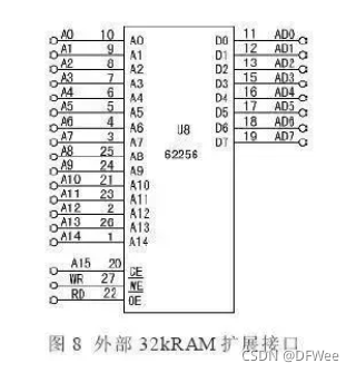 D0~D7接数据总线P0口,地址线A0~A14接单片机地址总线低15位,单片机地址线A15接RAM片选信号,低电平有效,这样RAM地址分配从0000H到7FFFH,与74138译码地址不冲突。