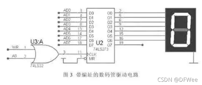 WR与A8(P2.0) 相或提供74LS273的时钟信号,当执行“MOVX @DPTR,A”指令时,地址信息由DPTR寄存器确定,会出现有效的写信号WR,只有当地址A8为满足“0”时,写信号才可以作为74LS273的时钟信号输入,完成数据锁存。