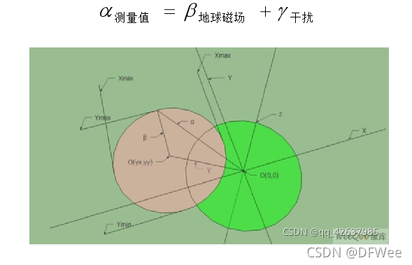 如图所示,在磁传感器的XYZ坐标系中,绿色的圆表示地球磁场矢量绕Z轴圆周转到过程中在XY平面内的投影轨迹,再没有外界任何磁场干扰的情况下,此轨迹将会是一个标准的以O(0,0)为中心的圆。当存在外界磁干扰的情况时,测量得到的磁场强度矢量α将为该点地球磁场β与干扰磁场γ的矢量和。记作: