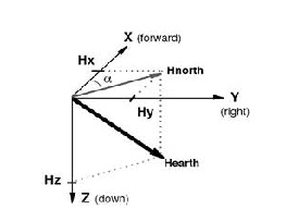 因为地磁场是一个矢量,对于一个固定的地点来说,这个矢量可以被分解为两个与当地水平面平行的分量和一个与当地水平面垂直的分量。如果保持电子罗盘和当地的水平面平行,那么罗盘中磁力计的三个轴就和这三个分量对应起来。