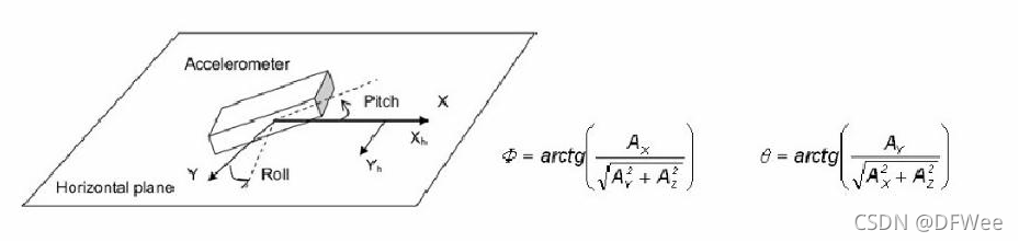 加速度: 加速度可以通过三轴数据求出姿态角,虽然静态稳定性有优势,但是动态效果就比较差;