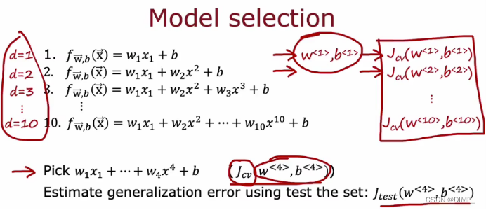 选择合适模型:使用训练集拟合参数,使用交叉验证集选择模型,使用测试集估计泛化误差