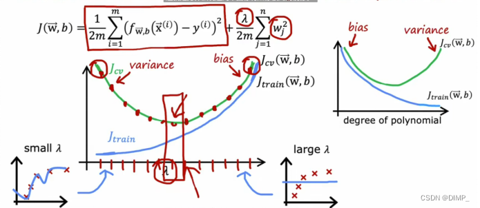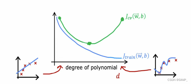 多项式次数的增加,先欠拟合、后恰好拟合、最后过拟合,Jtrain 越来越低,Jcv 先降低后升高