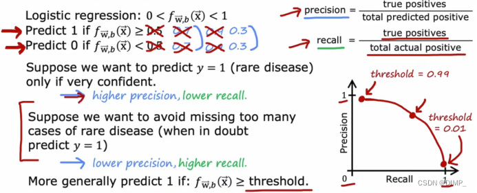 若使用逻辑回归算法,当提高阈值时,准确率提高,召回率降低;降低阈值时,准确率降低,召回率提高