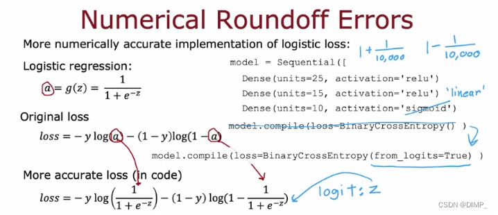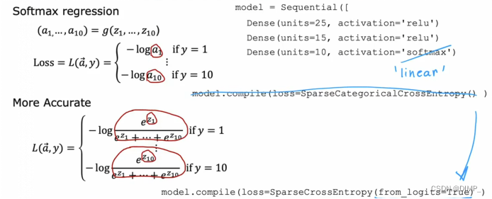 改进代码能够将输出层的激活函数改成线性激活函数,TensorFlow 可以重新排列这个表达式中的项,使计算变得更准确