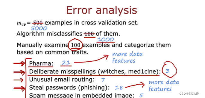 错误分析是一种诊断模型的方法,指手动查看出现错误的样例,并试图深入了解算法出错的地方(一般是按照共同的属性将他们分组)