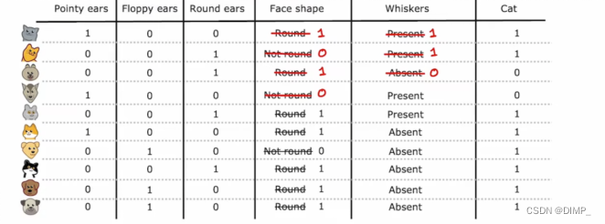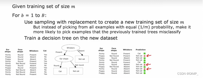比如:原始训练集中有 10 个动物,我们做 10 次有放回抽样,得到一个新的训练集。抽样放回对于构建树集合有关键作用