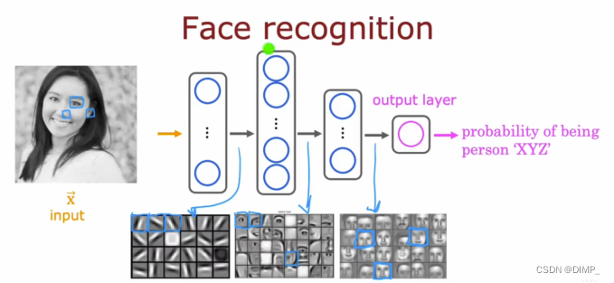 第一个隐藏层中,每个神经元在寻找图像中非常短的线条;第二个隐藏层中,每个神经元在学习把之前找到的短线条组合在一起,找到面部的一小块区域;第三个隐藏层中,每个神经元在聚合面部的不同部分,形成粗糙的面部形状。可以发现对应的原图像的区域越来越大。