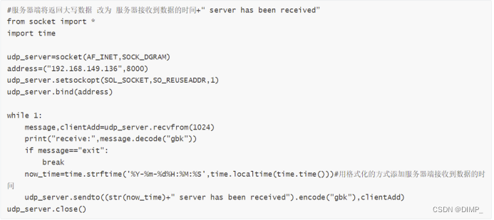 udp_server.sendto((str(now_time)+" server has been received").encode("gbk"),clientAdd)
