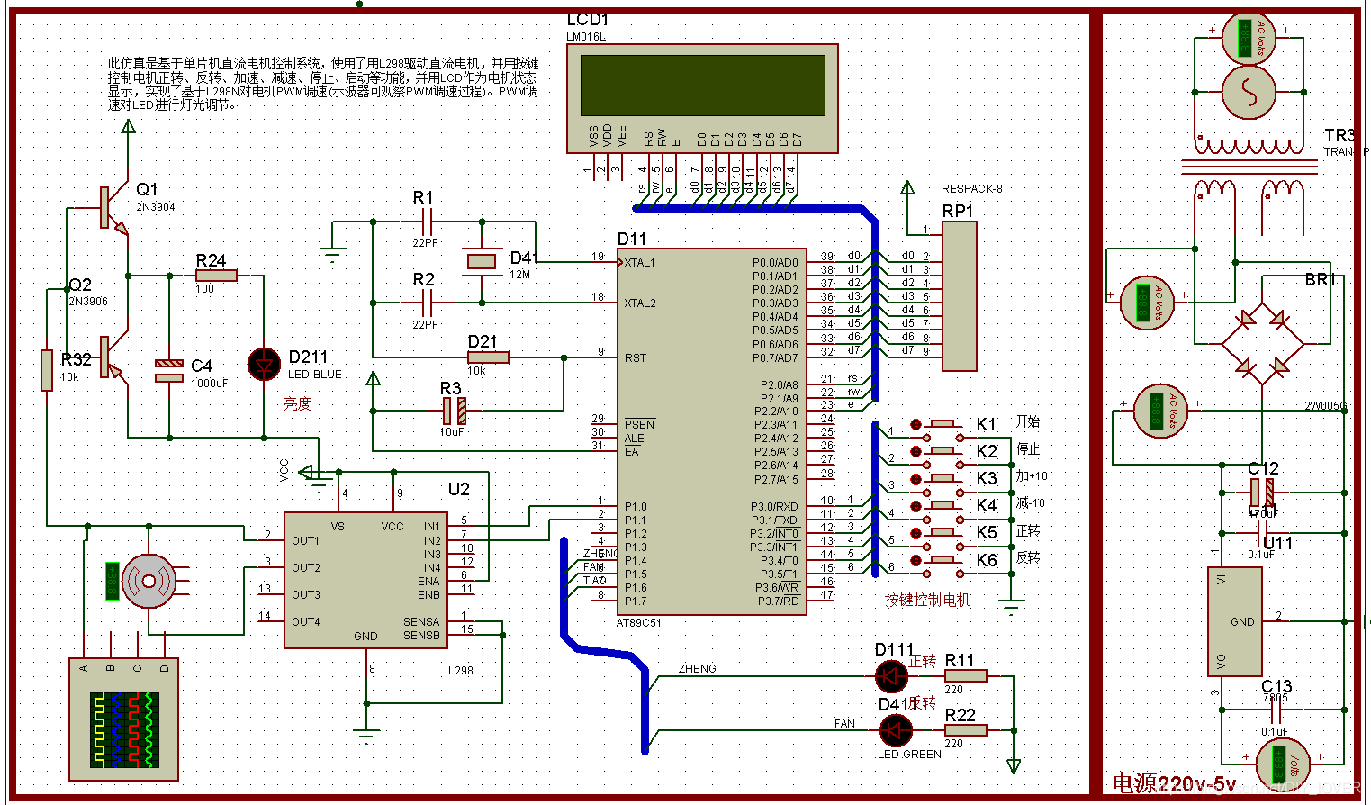 此仿真是基于单片机直流电机控制系统,使用了用L298驱动直流电机,并用按键控制电机正转、反转、加速、减速、停止、启动等功能,并用LCD作为电机状态显示,实现了基于L298N对电机PWM调速(示波器可观察PWM调速过程)。PWM调