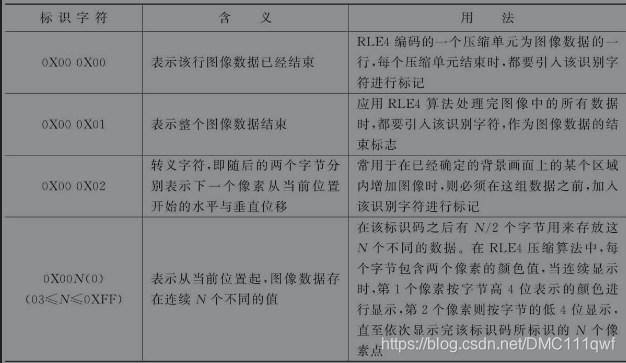 msrle_decode_pal4()是decode depth 为4 的函数,也就是decode RLE4 的函数。 RLE4与一般的行程编码算法相同点是都以两个字节表示图像数据中一串重复的数据。其中第1字节表示数据重复次数,第2字节表示重复数据自身。不同点是RLE4压缩算法在第1字节中所表示的重复数据的次数是像素重复次数,而不是一般RLE编码中所定义的字节重复次数。例如,一般RLE编码中的数据0X08 0X58表示将图像数据0X58连续重复显示8个字节,但在RLE4压缩算法中,则表示连续显示8个像素。另外,RLE4压缩算法与一般RLE压缩算法不同点还表现在:由于是针对16色图像数据,如表9-8所示,引进了4组特殊的识别码。