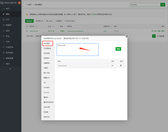 在宝塔面板里,你会看到网站已经创建并配置完成,名为 discuz.local