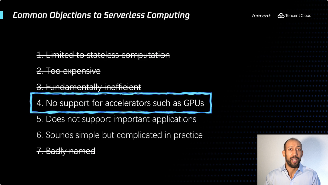 有一些人说,你所运行云函数它们实际上是无状态的,所以当你的程序运行结束时,数据就会被清除;还有一些人抱怨它有点贵;还有反对的观点说这可能造成效率降低,因为你正在将计算和状态分开;另一个挑战的点是,有时会被认为缺乏对 GPU 等硬件加速器的支持;还有人会说,我搞的这些应用程序,他们都无法使用Serverless的方式运行;还有人说,也许 Serverless 听起来很简单,但实际落地起来却很困难。