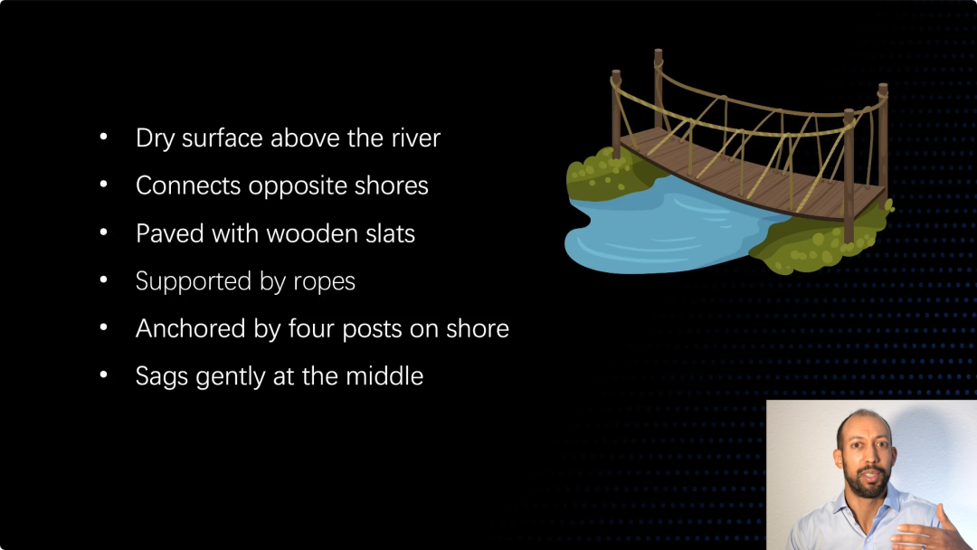 请看这是什么,这是一座桥梁。它是一座横跨溪流的桥梁,它有相当多的属性。这是架在水上的干燥路面,它连接着两岸上面铺装了原木,它有四根支撑,两端都有斜坡,中间的部分很平整。这些是用来创造桥梁的技术,你明白它的作用是什么,连接河岸两端的能力也有很多属性。