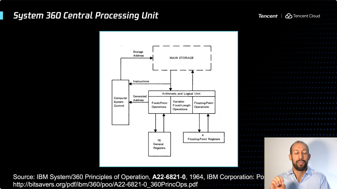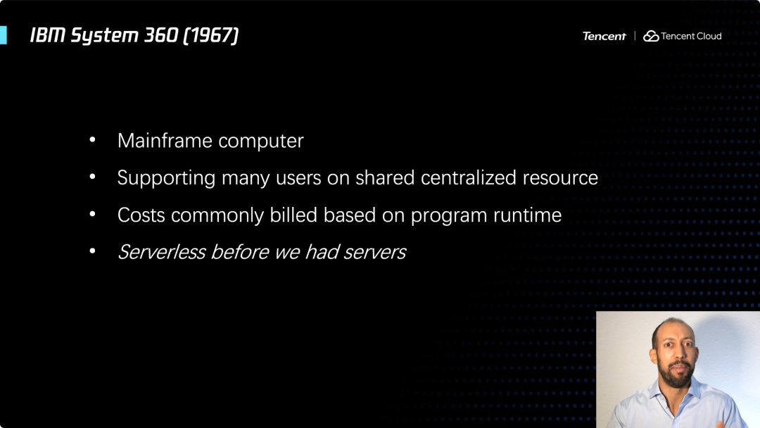 它是一个大型计算机,意味着是一个支持许多用户的集中式资源。在1960年代,这是一项巨大的进步,能够真正有效地将公司一台大型计算机的资源和时间进行共享,分配给各个团队使用。现在你看到这个大型计算机,实际上会意识到,在20世纪60年代,在这些大型计算机上正在实现的许多东西,与我们今天在云计算和 Serverless 计算中追求的价值非常相似。