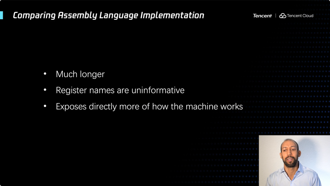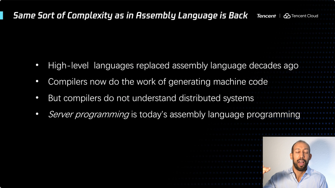 为了说的更加具体,我就像这样对比一下。用汇编语言编程,要处理寄存器的名称,要处理特定的内存单元和地址。当你使用高级编程语言时,这些东西就消失了对吗?你永远也看不到寄存器,编译器会完全处理它,将其隐藏起来,包括内存地址。在一些不那么高级的语言 (如C语言) 中你还会看到这些。但可以肯定的是,一旦你使用了像 Java 这样的语言,内存地址就完全消失了。如果谈及云服务,也会有服务器地址,我的观点是这不属于云,它将消失!