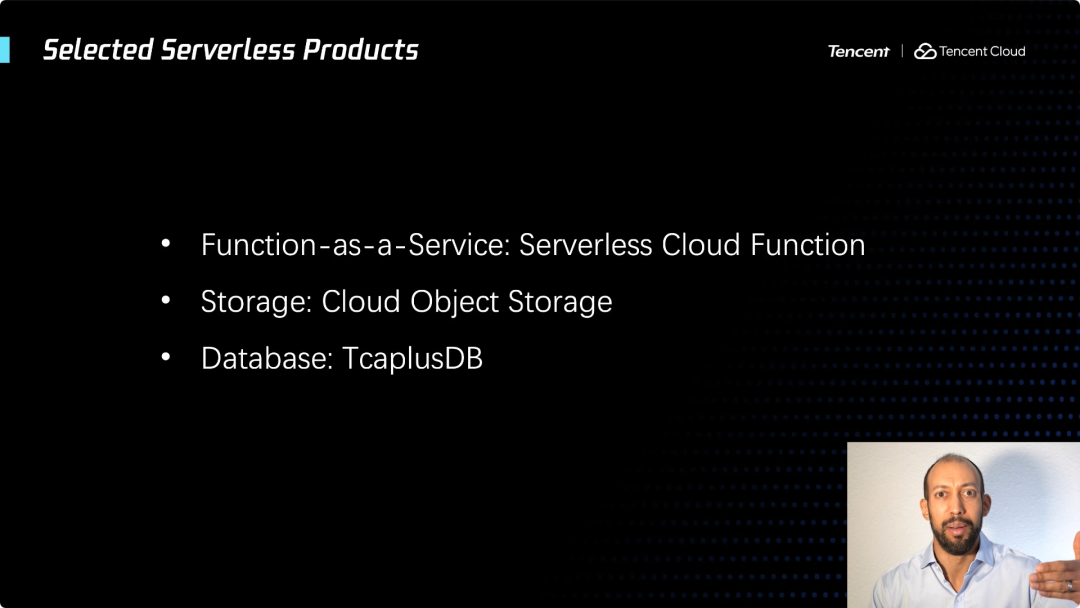 在 Serverless 产品方面,我想你可能有了一些了解。比如腾讯云已经提供的 FaaS 产品服务,Serverless 云函数(SCF)。这些产品允许你在云中运行代码和计算任务,而不需要考虑基础架构,也不需要考虑运维,这确实是促使人们对 Serverless 感兴趣的原因。稍后我会详细介绍这一点,但我想强调一下, Serverless 不仅仅与计算有关,还有 Serverless 存储,例如腾讯的云对象存储(COS),还有 Serverless 数据库服务,比如 TcaplusDB。