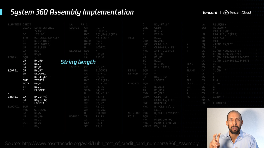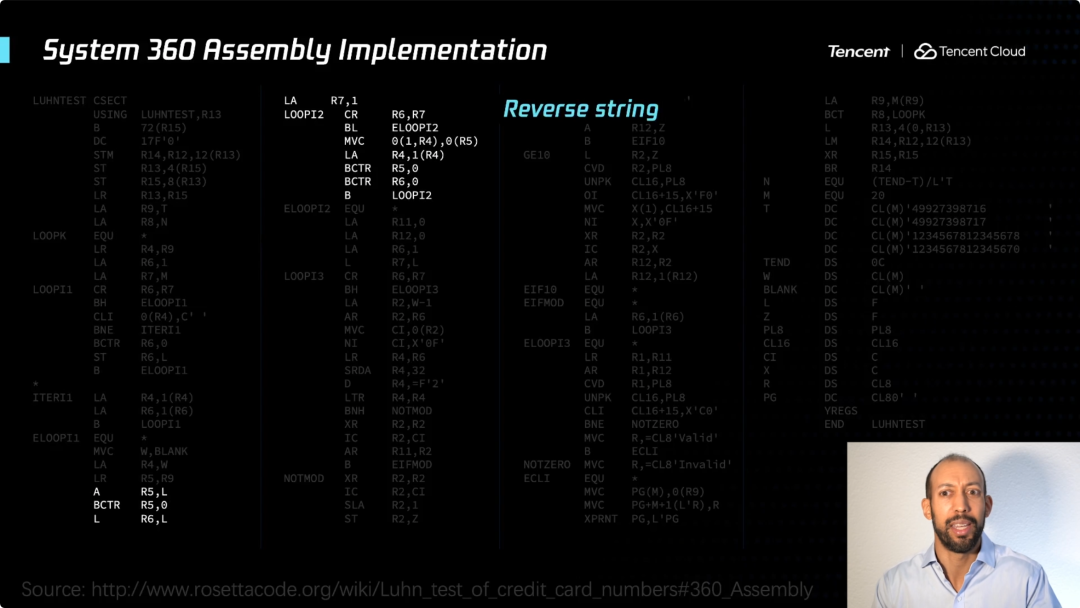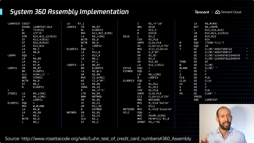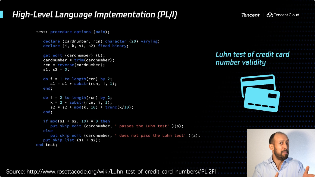 事实上,如果我们使用像PL/1这样的编程语言。这代码看起来可能你们大多数人都不认识,当你看到它,可能你会说这可能是2020年最新最伟大的新语言,就这么简单。右读一些输入,得到该数字,颠倒它,然后对奇数位和求和,然后对一些偶数和求和,并根据需要执行判断逻辑,看看它是否被10整除,如果是则通过测试,否则就不通过。这个十分简单。