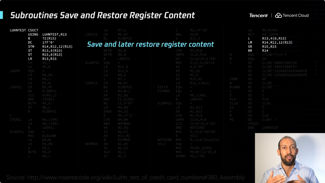 此处从寄存器的操作开始。什么是寄存器呢?我们知道在CPU内部有固定数量的存储单元,这些存储单元用于基本操作、算术运算、访问内存单元、加载和存储等。如果你准备编程,必须弄清楚你要如何使用这些寄存器。这只是复杂度的一部分,你还必须在编程时考虑,如何确保你空间足够使用。这些操作与计算信用卡号码的校验和无关,这只是当你用汇编语言编程时,必须要发生的一些工作。