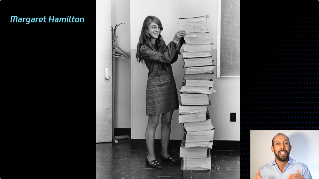 这是 Margaret Hamilton 的照片,还有一堆阿波罗制导计算机的汇编语言代码的打印件,我认为这真的是个很酷的东西。她是该项目的首席软件开发人员,在1969年编写了火箭载着宇航员导航到月球的程序,使用的技术比我们今天要原始得多。