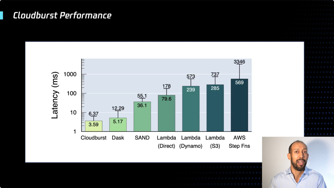 如你所见,CloudBurst 解决了延迟,这里我们对比了一个函数调用另一个函数的场景,只是进行一系列简单的操作。我们看到与目前公共云的相比,这里的延迟大大减少了。