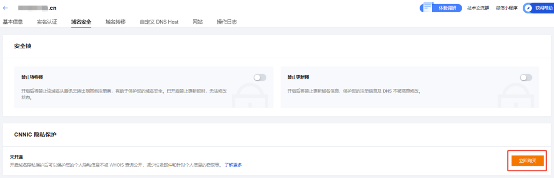 4)找到"CNNIC隐私保护"选项,点击 ““立即购买” 按钮。