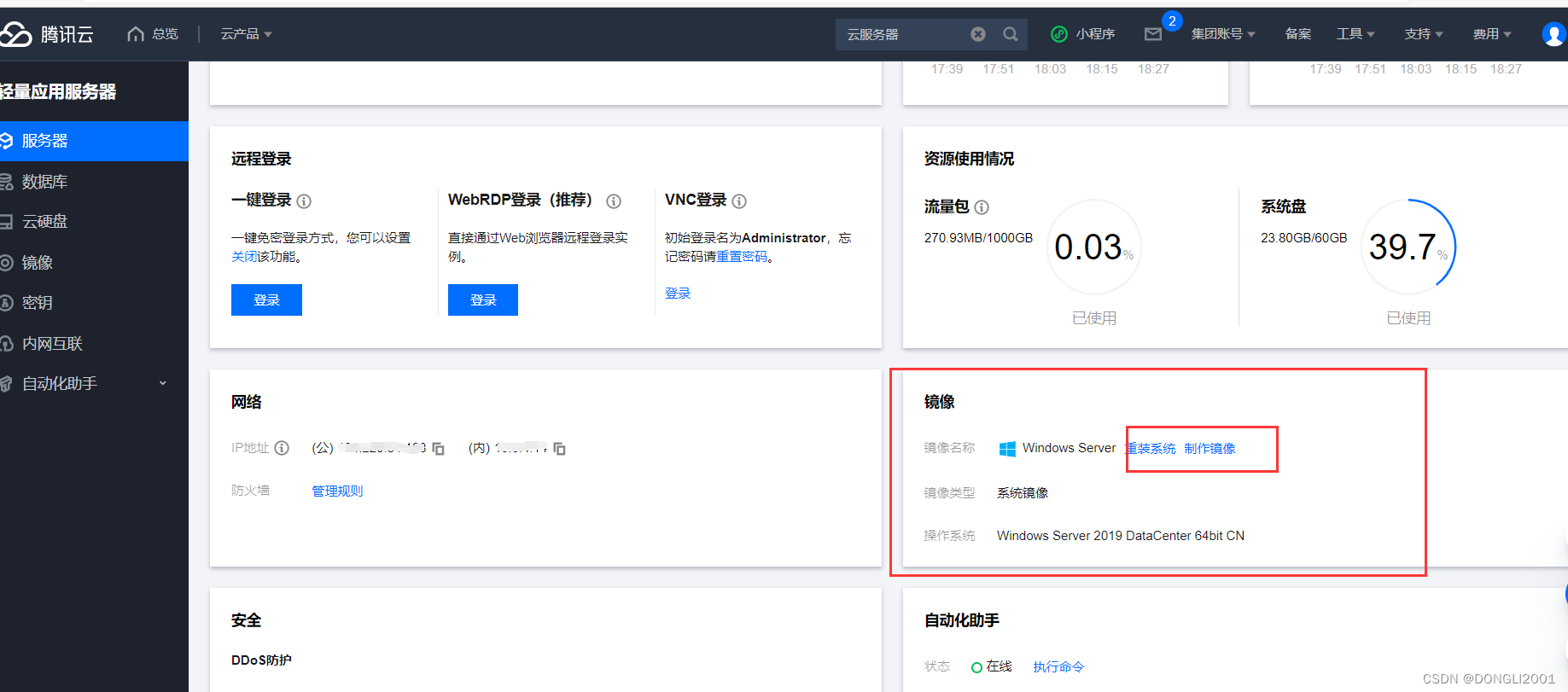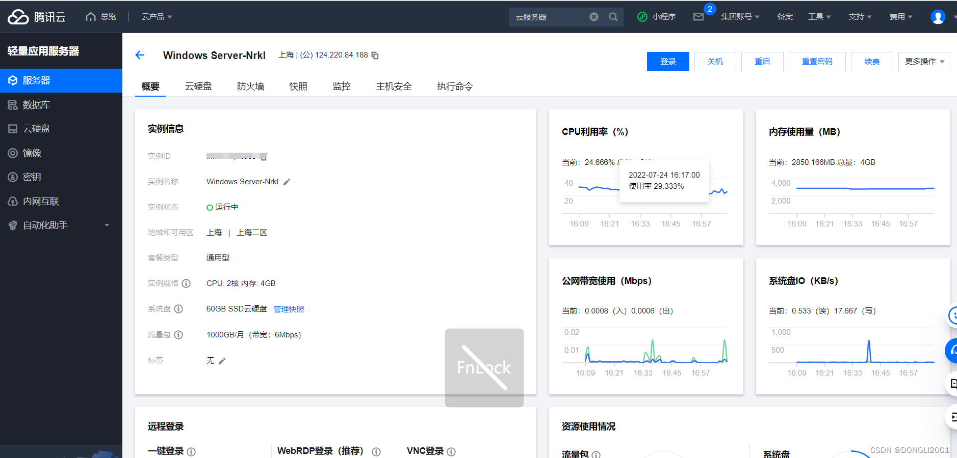 - 按需购买:根据云主机内存大小,硬盘容量,服务器带宽、操作系统不同所售价格也不同,这里我们用的是腾讯云,购买成功后进入控制台即可看到如下场景