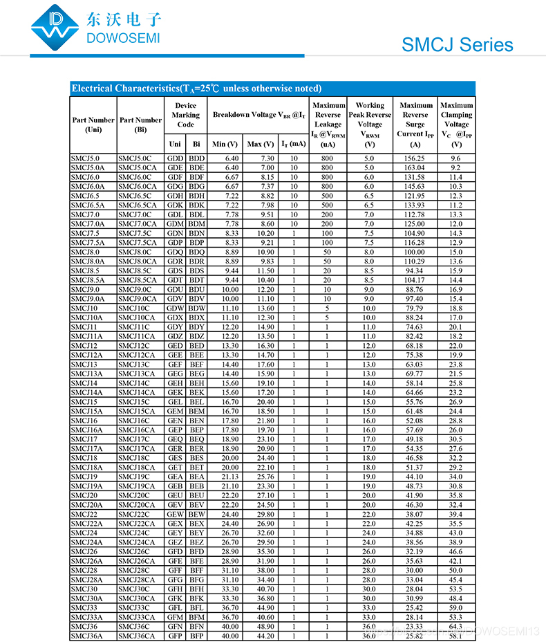 由于型号太多,以上列举的只是部分SMCJ系列TVS二极管丝印型号对照表,想要了解更全面的,详见东沃电子SMCJ系列贴片TVS瞬态抑制二极管产品手册!
