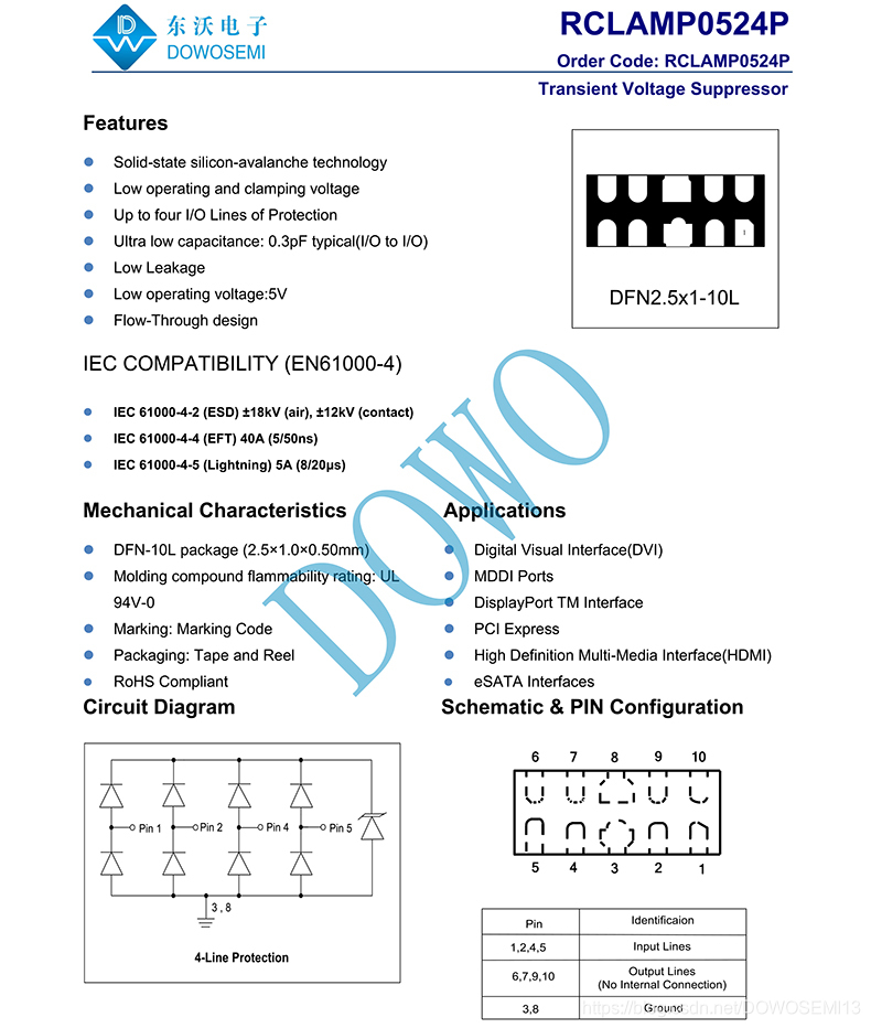 RCLAMP0524P超低电容TVS,超低结电容0.3pF典型,固态硅雪崩技术、低工作电压低钳电压、最多保护四个I/O高速数据线、低漏电流、优化的高速线流封装设计,广泛应用于数字视频接口(DVI)、MDDI端口、高清多媒体接口(HDMI)、DisplayPort、TM接口、PCI快车、eSATA接口等高速数据接口领域。RCLAMP0524P具体参数如下: