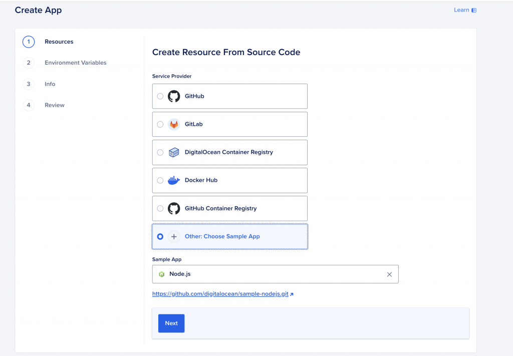 接下来,选择“Other: Choose Sample App”,从Sample App 下拉菜单中选择 Node.js 示例应用程序,并单击Next。
