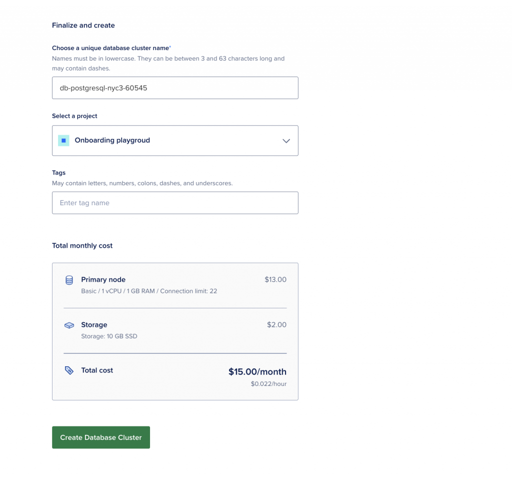 按照屏幕上的说明操作,完成数据库设置后,单击 Create Database cluster。