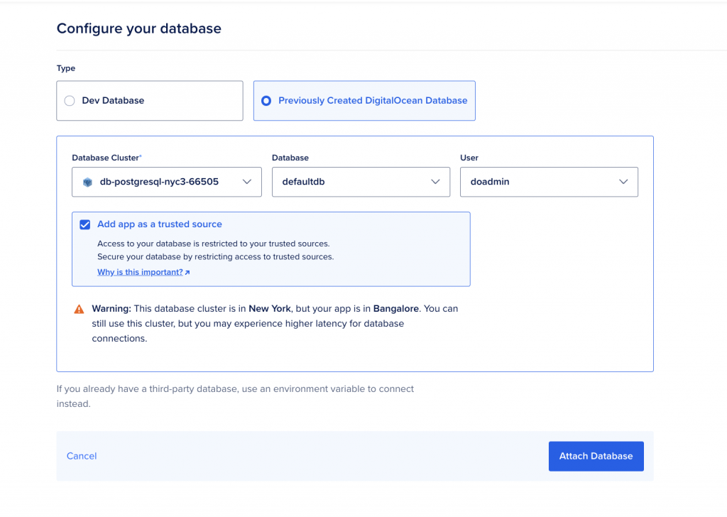 选择“Previously Created DigitalOcean Database”,然后选择最近部署的 PostgreSQL 托管数据库集群,点击底部的“Attach Database” 按钮。