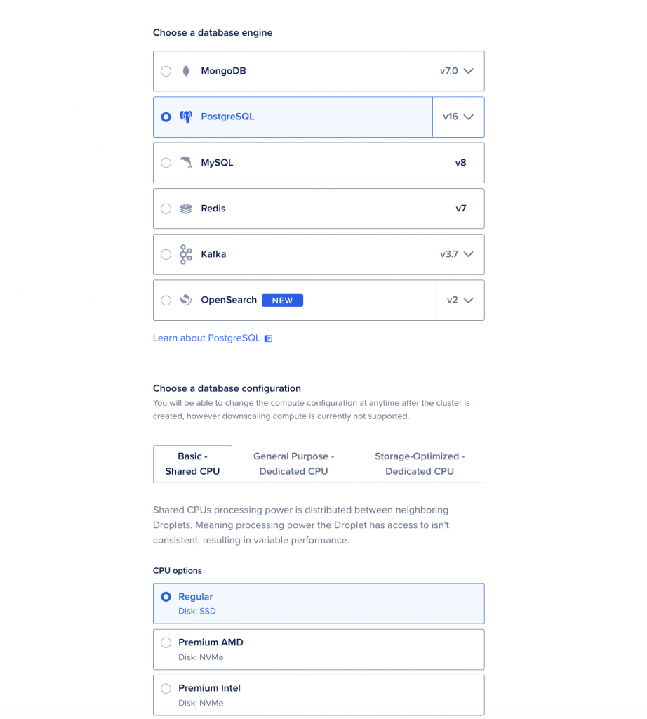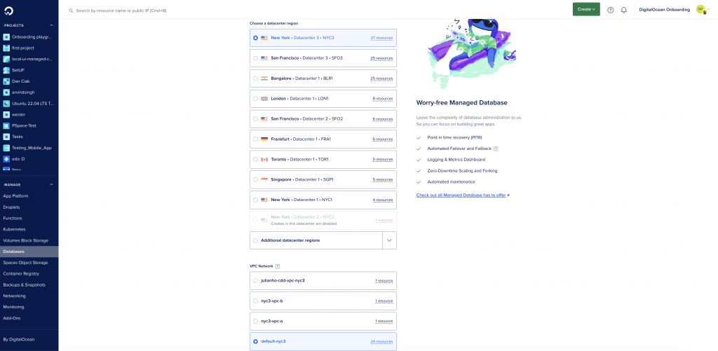 单击“创建数据库群集”,然后选择 PostgreSQL。你将会选择一个数据中心区域和 VPC 网络,如下图所示: