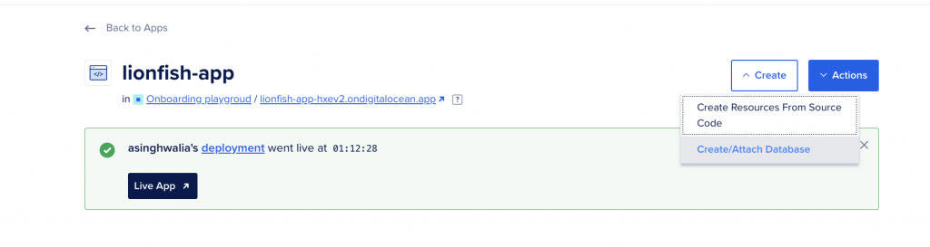 导航到已部署的 App Platform 应用程序,单击已部署应用程序仪表板上的Create按钮,然后单击 “Create/Attach Database”。