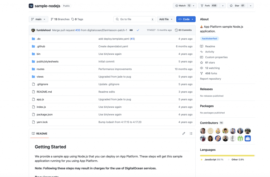你可以按照以下步骤部署 Node.js 示例应用程序,或者使用这个 GitHub 仓库在 App Platform 上创建 Node.js 示例应用程序。
