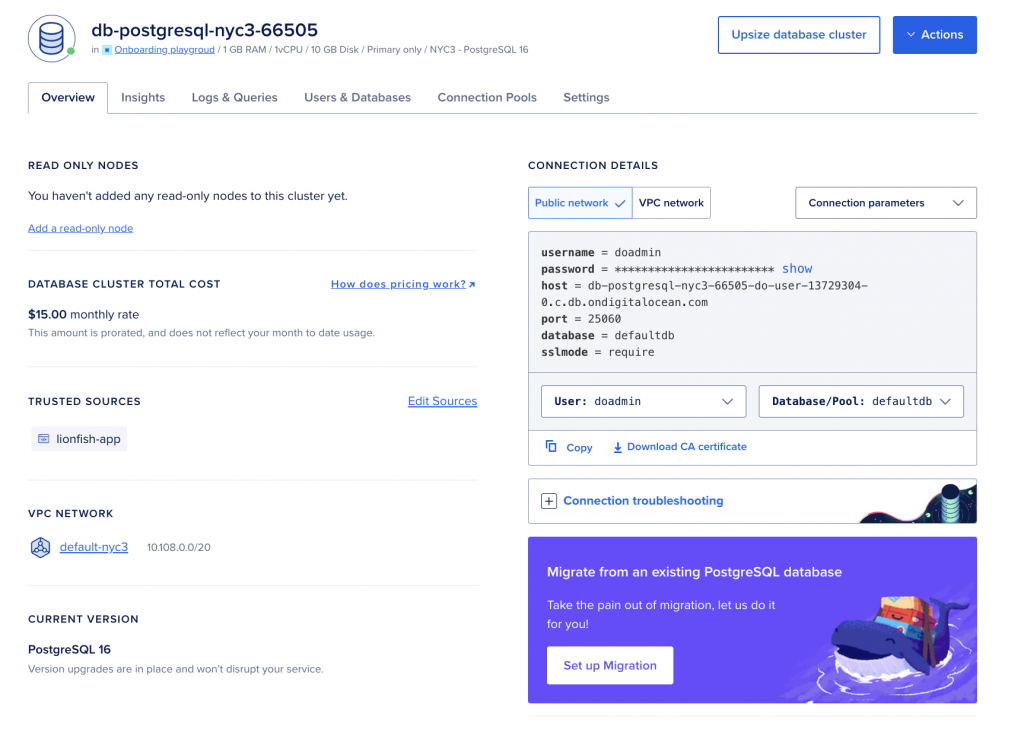 在上面的输出中,请注意主机和端口对。在我们的例子中,主机是 db-postgresql-nyc3-66505-do-user-13729304-0.c.db.ondigitalocean.com,端口是 9273。