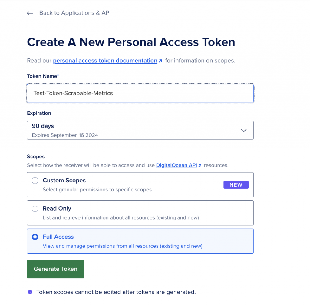 首先,前往 DigitalOcean 控制面板上的 API 部分,创建一个Create A New Personal Access Token,然后单击Generate Token with Full Access。请记下这个访问Token,因为在接下来的步骤中会用到它。