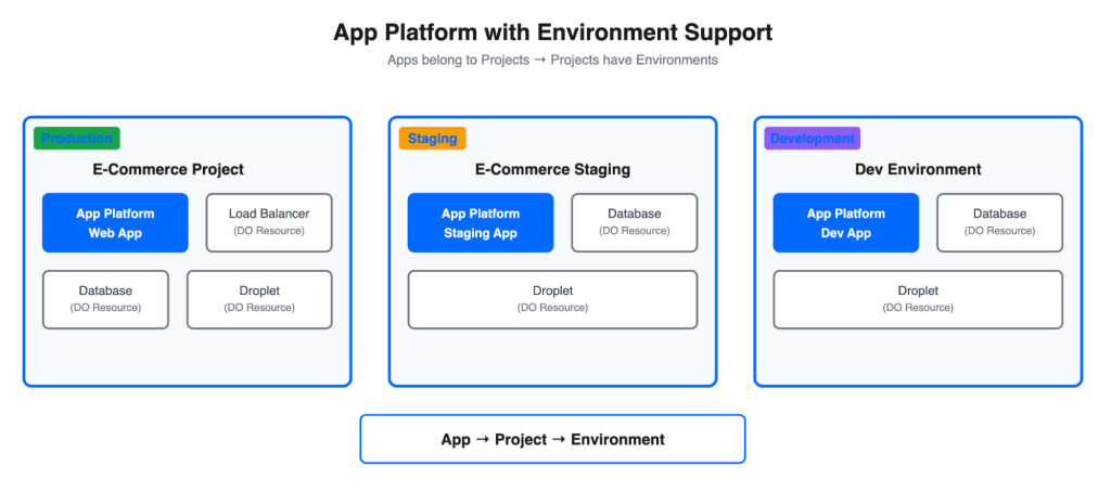 DigitalOcean 近期宣布一种全新的强大方式来应对这种复杂性:**DigitalOcean App Platform (应用托管平台)现已支持环境管理(Environment Support)**,该功能基于 DigitalOcean Projects 实现。同时,我们还推出了 App 克隆(App Cloning) 功能,只需点击几下即可复制你的应用。