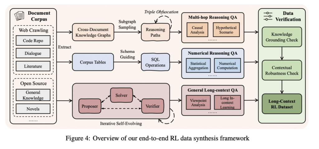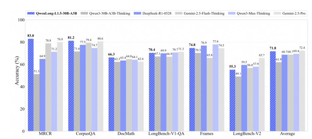 通过上述多阶段流程,QwenLong-L1.5 能够读取海量文档流,在长时间跨度内保持上下文一致性,并执行多步、循环式的推理过程——这些都是单一上下文窗口内无法完成的任务。