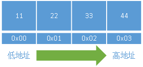 我们要存一个数据 0x44332211到这块内存里面去 如果系统是小端模式的话,存储方式如下图