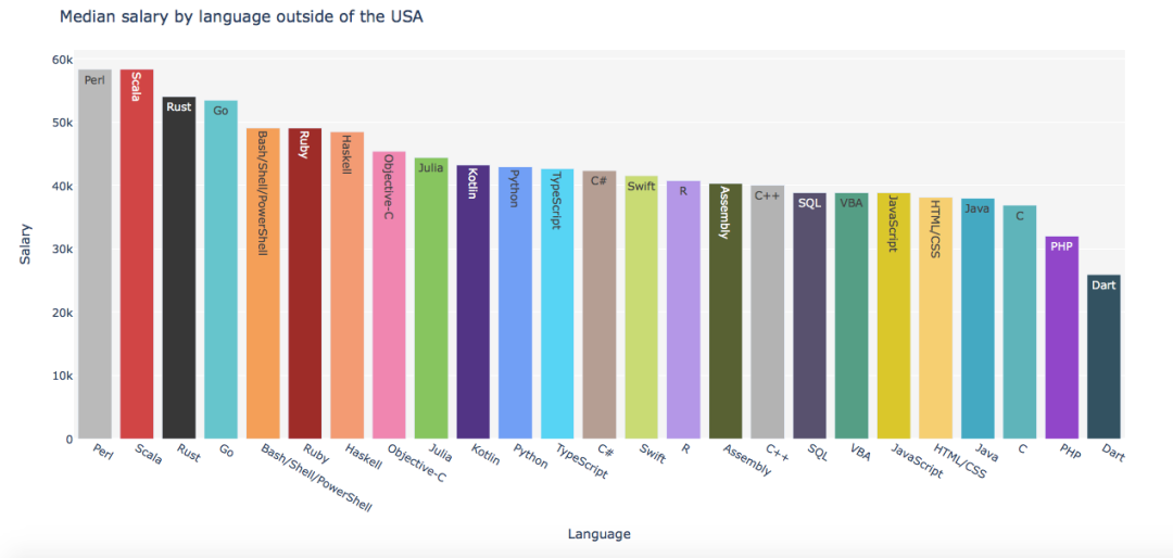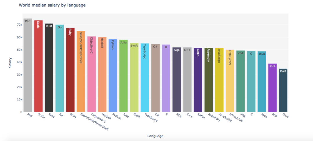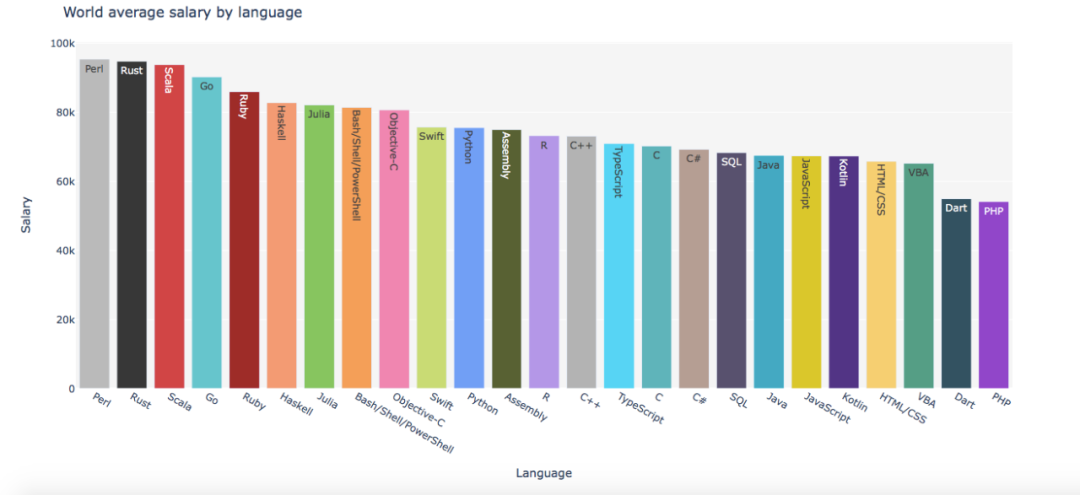 在全球范围内,使用 Perl 、Rust 、Scala 和 Go 语言的调查对象薪资水平往往最高,平均薪水在 9 万美元左右,Perl 之所以能位居榜首与其开发人员的紧缺不无关系;而长久以来被广泛运用的 Java 在薪资排行榜上则位于下游,平均薪资只有 6.7 万美元。