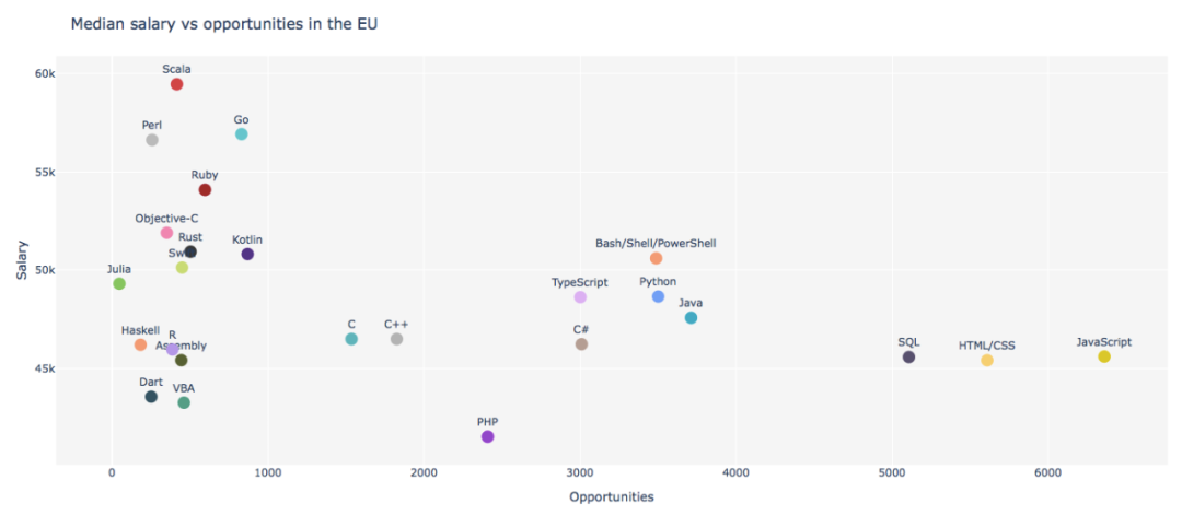 无论在哪个国家,Perl 、Scala 、Go 语言的薪资状况都名列前茅,但其工作机会往往十分稀缺,而薪资水平位于中下游的 HTML/CSS 、Javascript 则拥有更广阔的就业市场。
